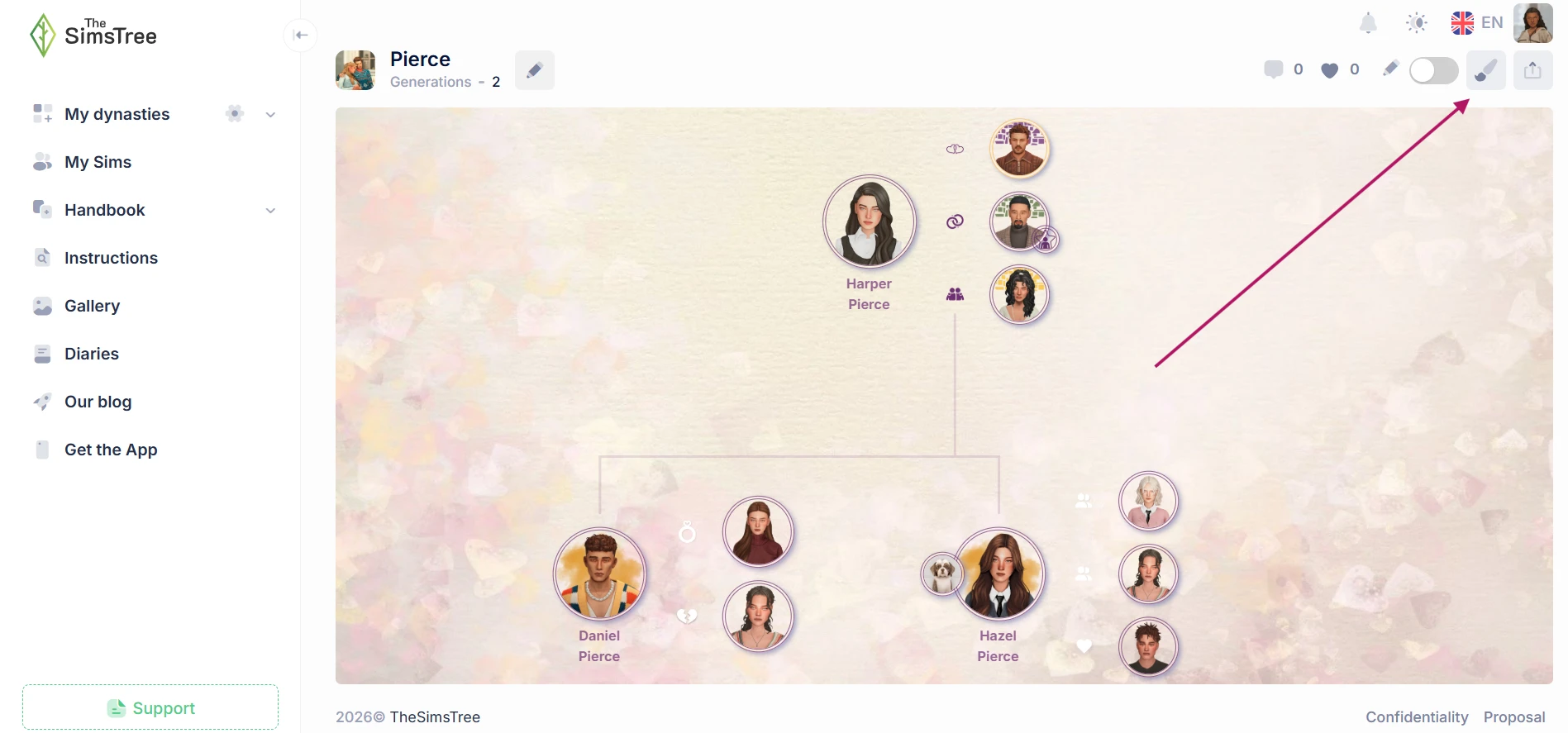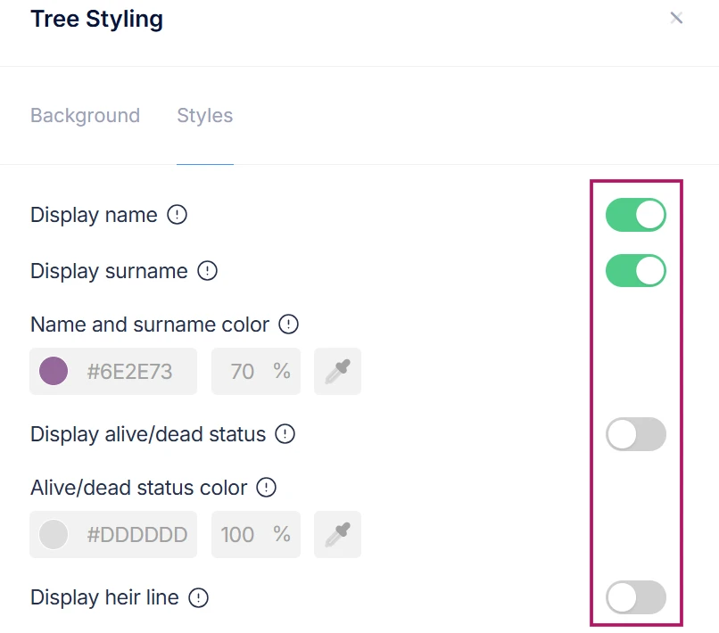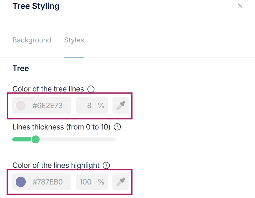 The "Tree Styling" section allows you to change the appearance of your tree: background, colors, etc. To access it, click on the brush icon in the top right corner, it's located between the tree editing and publishing icons.