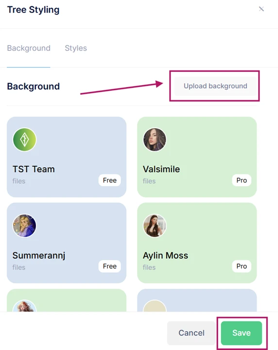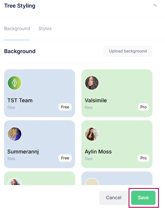 After opening the "Tree Styling" section, you'll land in the "Background" subsection. Here you can choose a background from a variety of pre-made backgrounds created by creators, or upload your own.