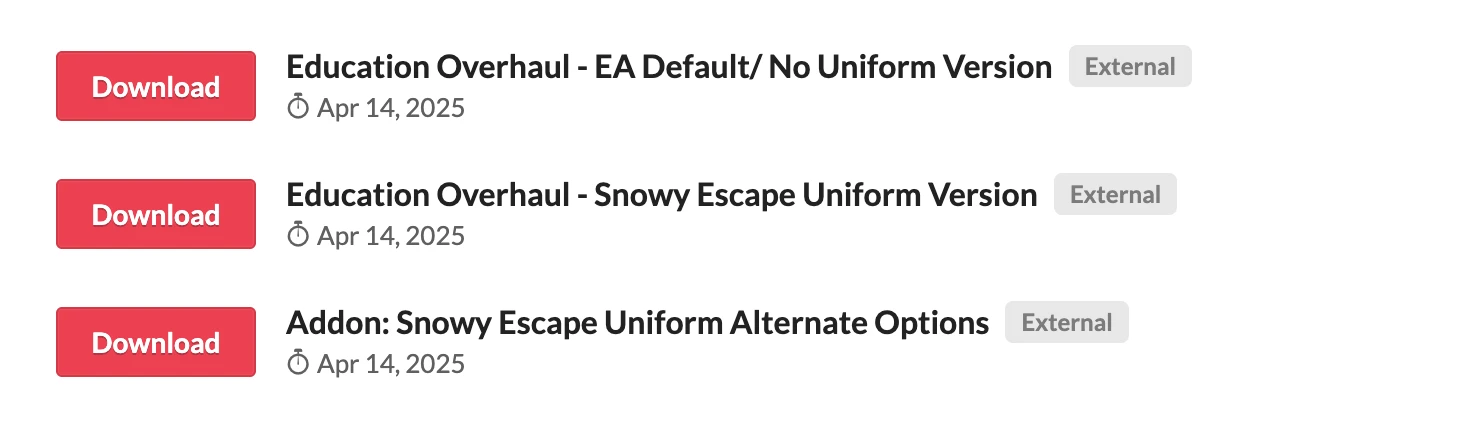Ещё есть возможность скачать школьную форму. Существует несколько версий: базовая, для тех кто владеет дополнением Снежные просторы и альтернативный вариант этой же формы. Выбирайте на своё усмотрение.