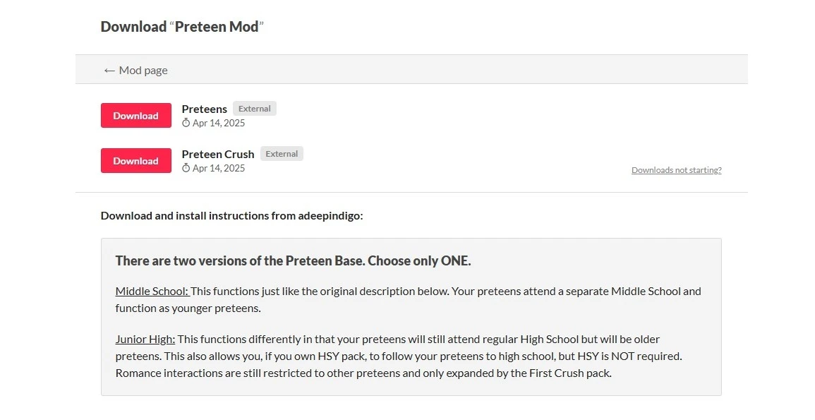 При скачивании мода обратите внимание, что представлено две версии. Версия для средней школы позволяет подросткам быть младше и посещать среднюю школу. Версия для младшей средней школы позволяет подросткам посещать новую ветвь старшей школы – младшую среднюю школу. Младшая средняя школа позволяет подросткам посещать активную школу вместе со старшеклассниками, если установлен мод HSY. В противном случае они попадают в «кроличью нору» старшей школы.