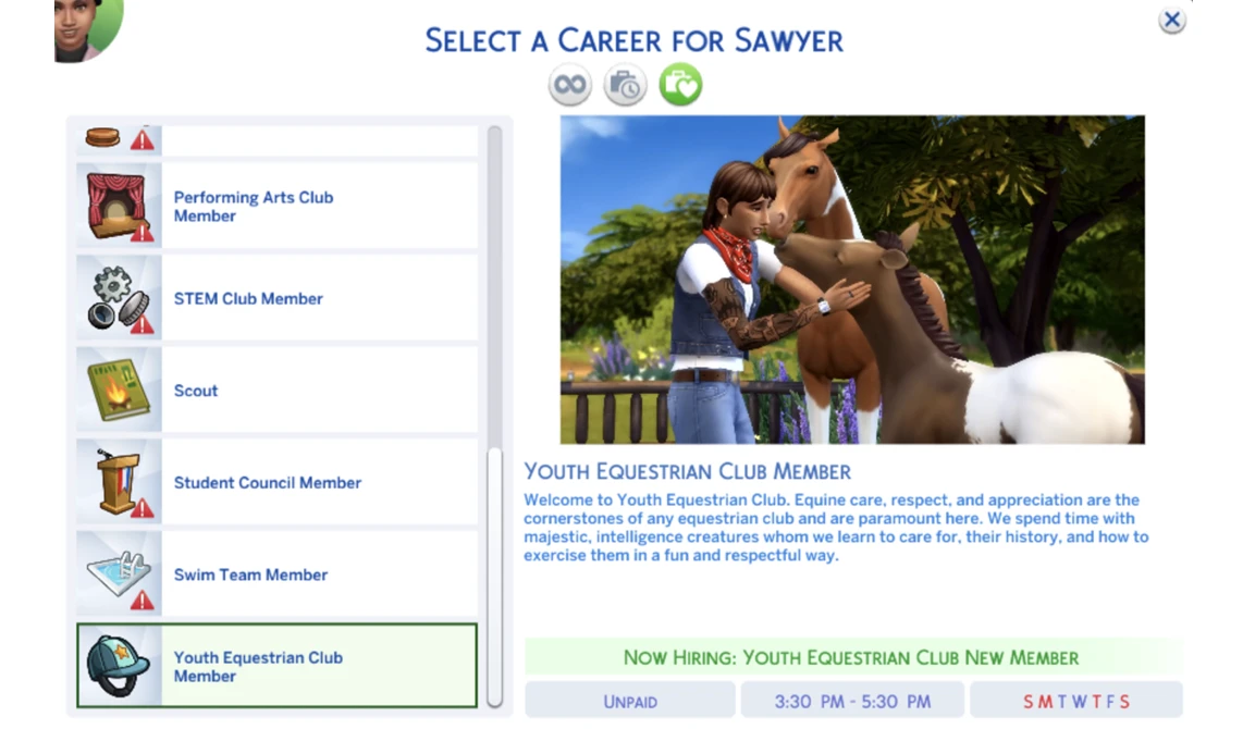 Занятия клуба проходят по вторникам, средам и пятницам. Ваши дети и подростки научатся ухаживать за лошадьми и, достигнув высокого уровня, смогут участвовать в юношеских конных соревнованиях в Конном центре (требуется дополнение «Конное ранчо»).