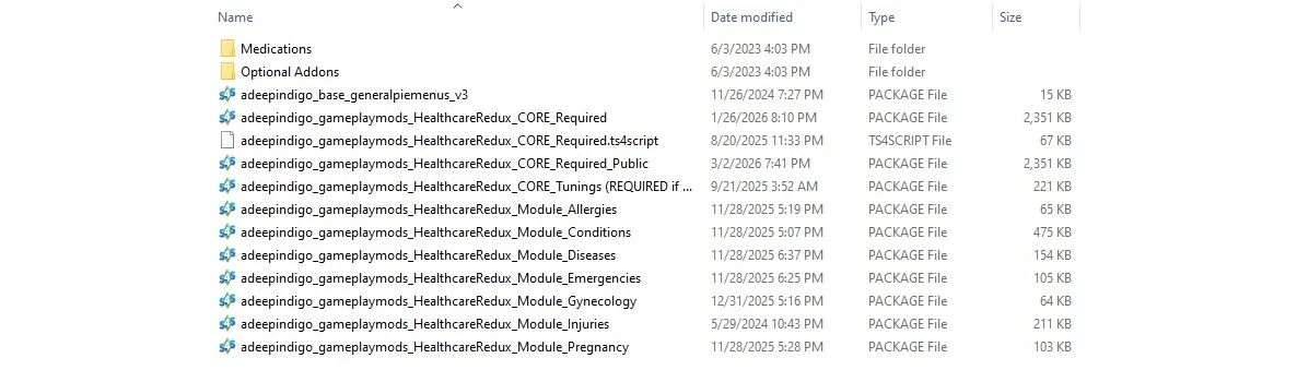 Здесь же автор указывает дополнительные моды для корректной работы и поясняет про отключение смерти от болезней. Чтобы симы болели, но не умирали, нужно поместить (а в нашем случае просто не удалять) файл ModDeath_GlobalDisabler, который находится в папке Optional Addons. В этой же папке есть другие файлы, которые вы можете удалить или оставить, если их функционал вам нужен.