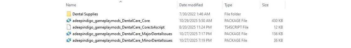 Обратите внимание, что мод конфликтует с любыми модами, которые изменяют файлы sink_Brush_Teeth и loot_sink_Brush_Teeth, включая моды на ускоренную чистку зубов (Faster Teeth Brushing, Brush the Taste Away). В самом Dental Care чистка зубов уже ускорена, так что отдельный мод не нужен.
